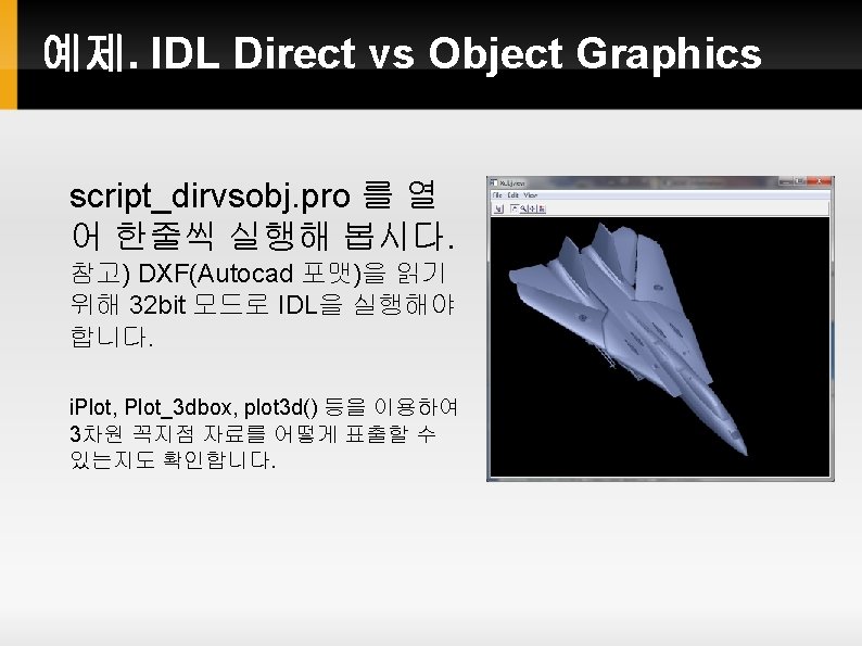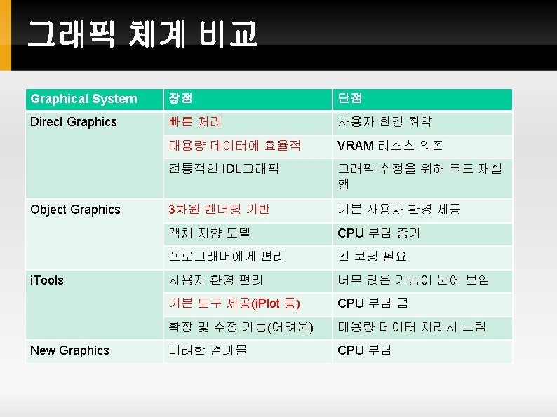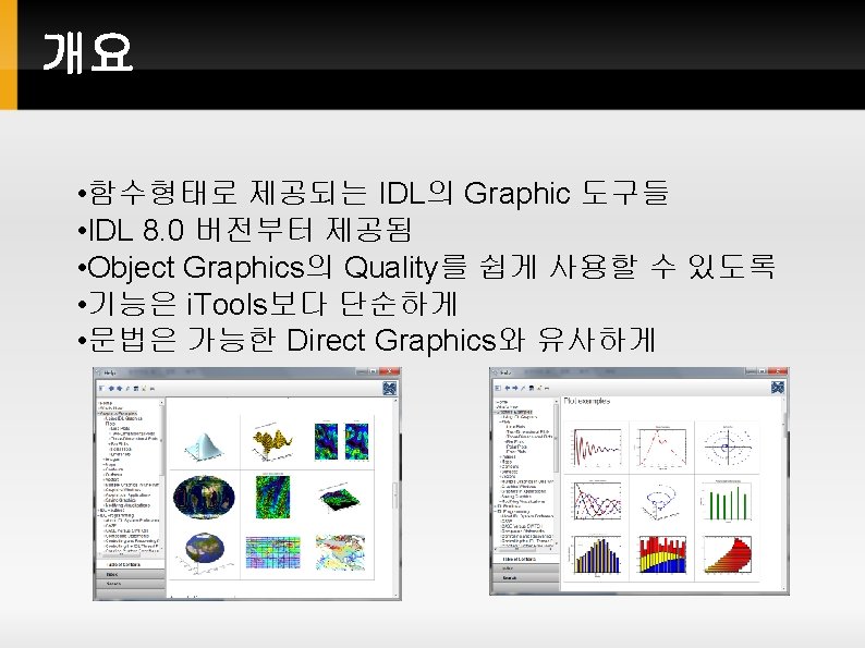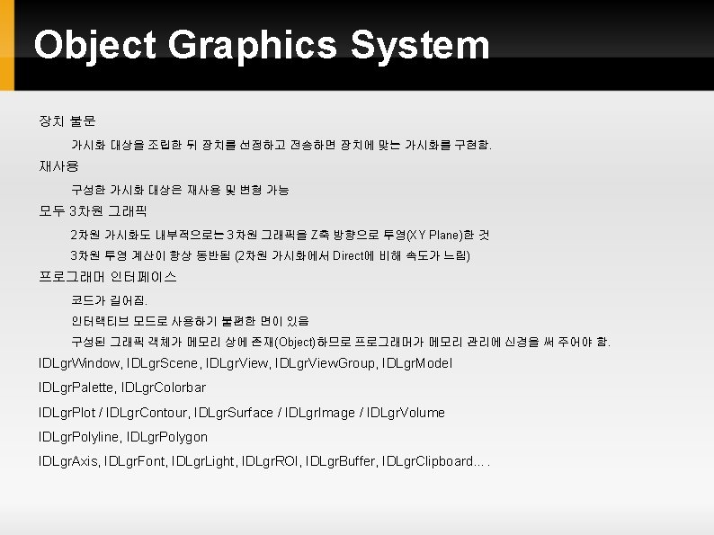 IDL Graphics System 개요 IDL Inteligent Tools(i. Tools) (Since 2003. v 6. 0) Object Graphics 를 사용자에게 쉬운 인터페이스로 제공 Interactive (Point & Click 위주) New Graphics (Since 2010. v 8. 0) Object Graphics 를 Direct Graphics와 유사한 문법으로 사용 Object Graphics (Since 1997. v 5. 0) 객체 지향 프로그래밍 기법 활용 모든 그래픽 요소가 객체(Object)인 데서 이름 유래 Direct Graphics (Since 1981. v 1. 0) Graphic 출력 결과를 “바로” 장치(화면/프린터/Post. Script 등) 으로 보내는 원리에서 이름 유래 현재 설정 장치 개념이 중료함