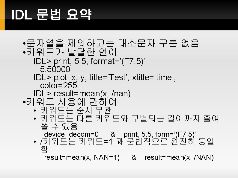 프로시저와 펑션 프로시저(Procedure) IDL> print, 30*!pi IDL> help, !values 펑션(Function) - 함수 IDL> a=sin(30*!dtor) IDL> print, factorial(4) ; 4! 같은 이름을 가지는 함수와 프로시저 IDL> plot, sin(indgen(361)*!dtor) IDL> p=plot(sin(indgen(361)*!dtor)