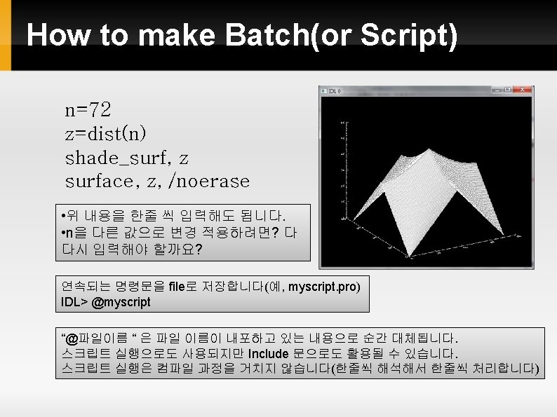 How to make Procedure pro twotimes, value = 2. 0 * value print, 'It was multiplied by 2. 0!!!‘ print, value end 1. Save it as twotimes. pro 2. Place it anywhere 3. IDL> twotimes, 3