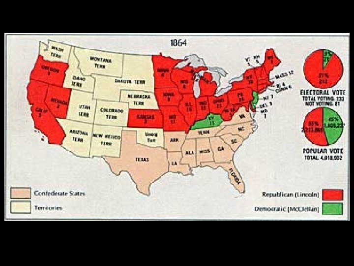 Election of 1864 • Lincoln faced a legitimate threat in Democrat George Mc. Clellan in the election of 1864 • Democrats favored ending the war even if that meant loosing the Confederacy