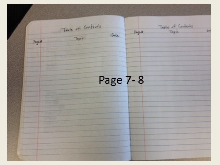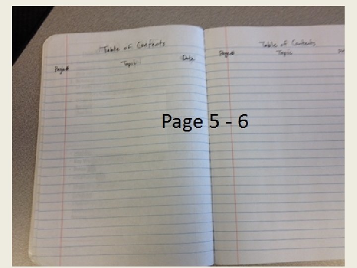 Table of Contents (put this at the top of the Page) • Skip 5 pages (back to back) right after the Author Page • Table of Contents should include the page number, topic of the day, and date • Example 1 Primary & Secondary Sources 8/6 • Students will be expected to keep up on this on a daily basis!!