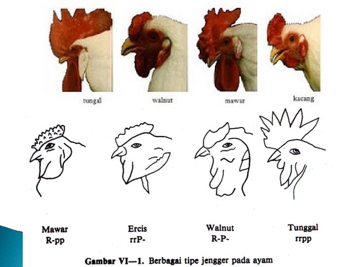 Jengger mawar ditentukan oleh gen dominan R (berasal dari “rose”) dan jengger ercis oleh gen dominan P (berasal dari “pea”). Karena itu ayam berjengger mawar homozigot mempunyai genotip RRpp, sedangkan ayam berjengger ercis homozigot mempunyai genotip rr. PP. Perkawinan dua ekor ayam ini menghasilkan F 1 yang berjengger walnut (bergenotip Rr. Pp) dan F 2 memperlihatkan perbandingan fenotip 9: 3: 3: 1.