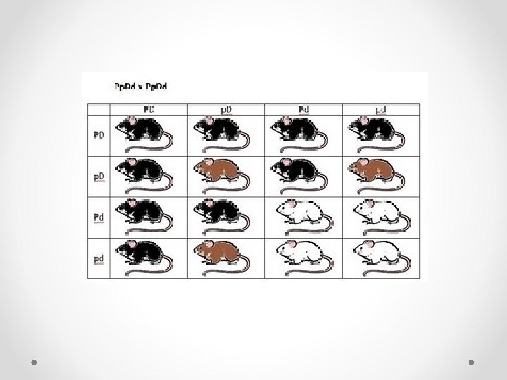 • Exemplo 2 - Epistasia Recessiva - pelagem em camundongos Cor preta P___ parda pp dd epistático (impede a manifestação da cor) D_ permite a manisfestação (puras) branco (albino) X parda (puras) PPdd pp. DD F 1 100% preto Pp. Dd (intercruzando) x Pp. Dd F 2 pretos 9/16 P__D__ brancos 4/16 __dd Pardos 3/16 pp. D__