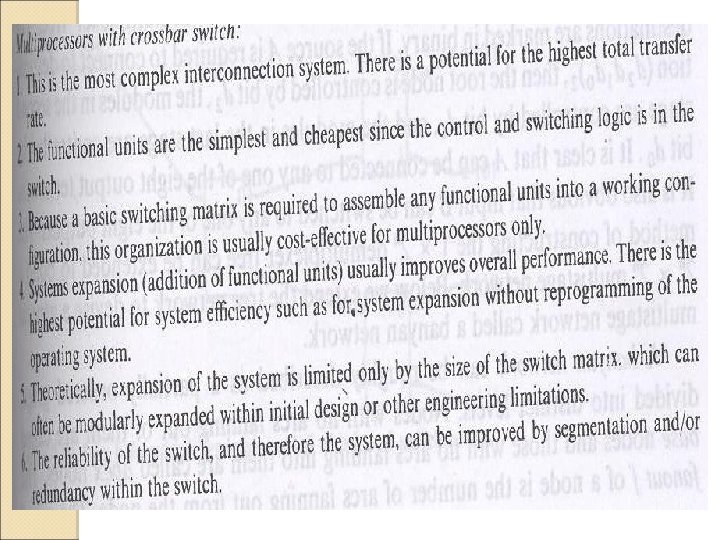 The cross bar switch possesses complete connectivity with respect to the memory modules because there is a separate bus associated with each memory modules. Therefore the max. no. of transfers that can take place simultaneously is limited by the no. of memory module and the band width speed product of the buses rather than by the no. of paths available.