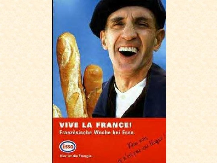 • 1. STEREOTYPES : / categories instant beliefs, simplifying reality caricatures (german = worker) fixed and uncompleted image • 2. PREJUDICE : subjectivity coming to a conclusion before knowing (german = war) judgment based on personal environment or first sight impressions • 3. JUDGEMENTS OF VALUES : beauty ? Different from REALITY judgment