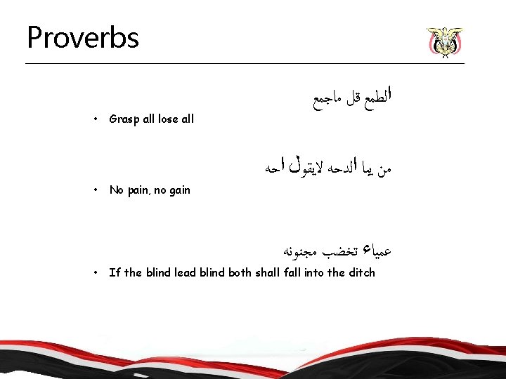 References: When the blind lead the blind, both shall fall into a ditch. (n. d. ). Retrieved April 11, 2015, from: http: //www. oxforddictionaries. com/definition/english/when-the-blind-lead-the-blindboth-shall-fall-into-a-ditch English Proverbs & Sayings. (n. d. ). Retrieved April 11, 2015, from: http: //www. learn-english-today. com/proverbs-G. html English Proverbs & Sayings. (n. d. ). Retrieved April 11, 2015, from: http: //www. learn-english-today. com/proverbs-N. html Syndiewinnie. (n. d. ). Retrieved April 11, 2015, from: https: //www. pinterest. com/pin/177681147770941929/ (Centre for Intercultural Learning, 2009) Yemen. (2007, September 1). Retrieved April 12, 2015, from: http: //www. swyaa. org/resources/handbook/Yemen. htm Battesti, V. (2001, January 1). An Outline of a Yemeni Body Language (Taiz and Sanaa). Retrieved April 12, 2015, from: http: //anthropoasis. free. fr/spip. php? article 39