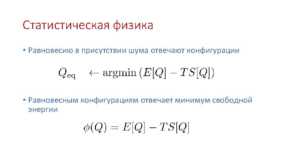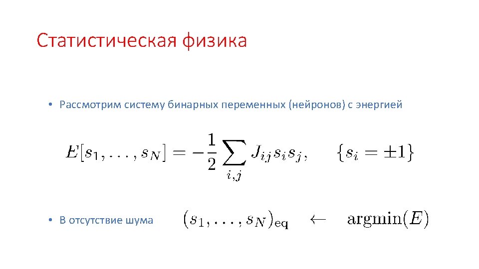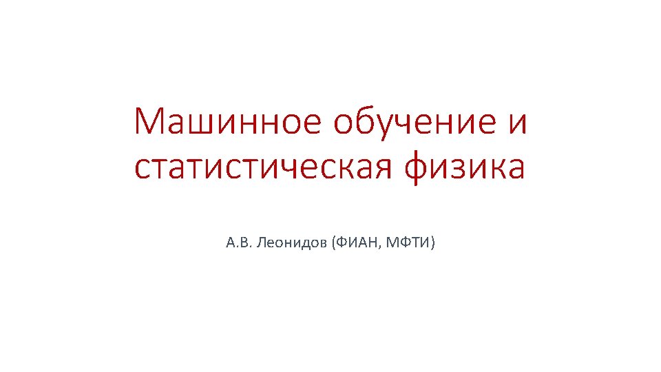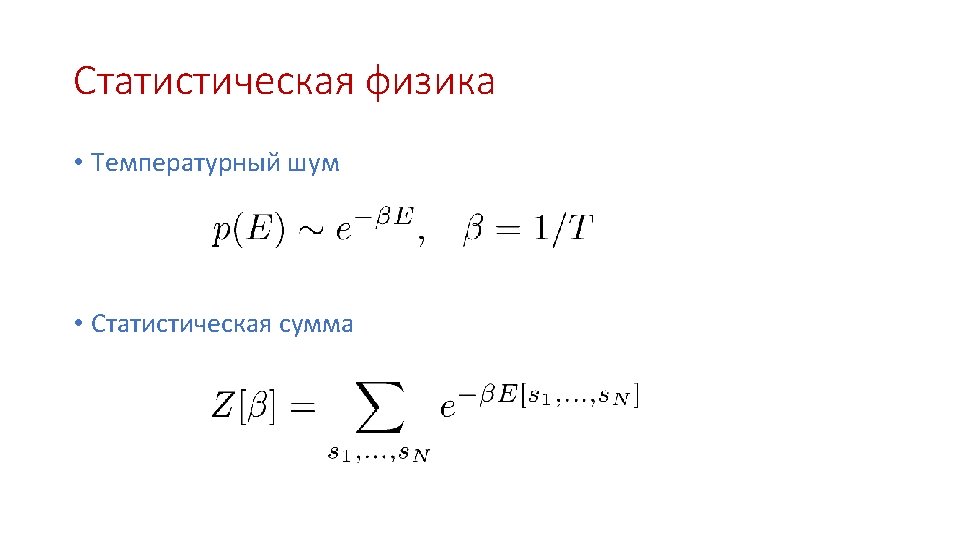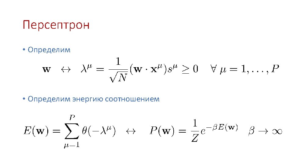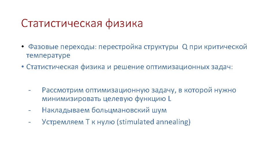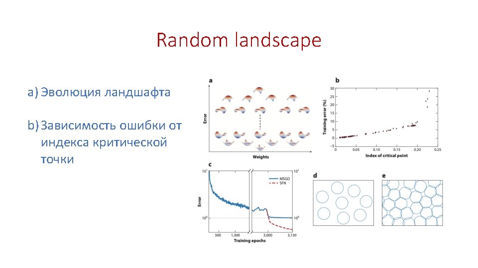 Machine learning and statistical physics • Treat a loss function as an energy landscape in the weight’s space • Optimal weights correspond to the minima of • Learning is a process of finding a way to the true minimum from some starting configuration • In typical complex energy landscapes in physics this process often terminates in a false minimum • Apparently this does not happen for deep networks. Why?