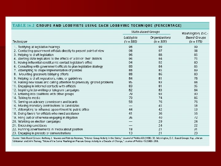 Goal: Lobbying n Employs more than 80, 000 in Washington DC alone n Named from days when Congress didn't live in Washington and stayed in boarding homes or hotels where lobbies were only place to catch and attempt to sway to your side n 23 ways for lobbyists and organizations to lobby on the state and national level § Most often they: testify at legislative hearings, contact government officials directly, help draft legislation