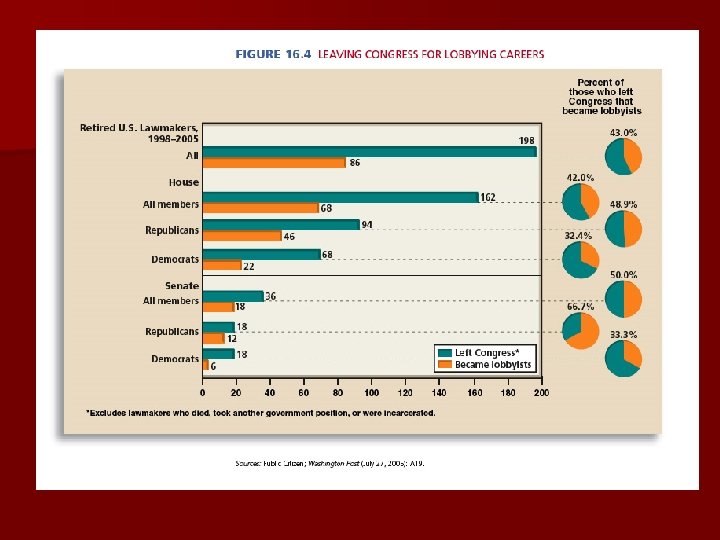 Lobbying Congress n Members of Congress are targets of lobbyists n Many lobbyists are former members n Lobbyists work closely with those members who share their interests n The effectiveness of a lobbyist depends on their reputation for fair play and accurate information