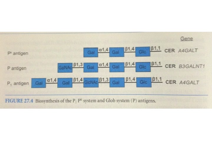 P 1 PK Blood Group System • Antigens: PK and P 1 (formerly P) • Defined by terminal galactosyl sugars on precursor glycosphingolipids or N-acetylgalactosyl (Gal. NAc) • PK: alpha-galactose on lactosylceramide – All RBCs express weakly • P 1: alpha-galactose on paragloboside – Receptor for microorganisms, E. coli and Streptococcus suis • P: – Receptor for parvovirus B 19 (erthema infectiosum)