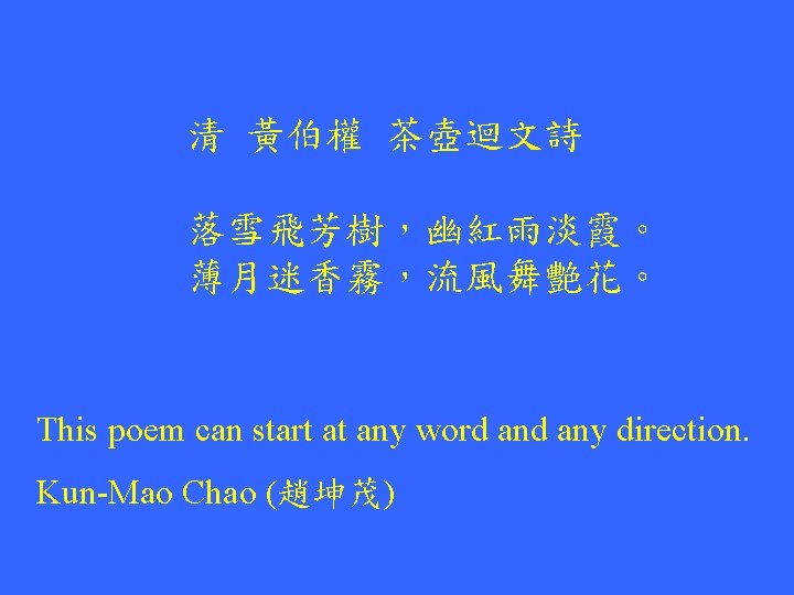 A Circular Sequence (This phrase can start at any word. ) 清 以 心 可 也 Kun-Mao Chao (趙坤茂) Source: 小時候鄰居冰店的招牌