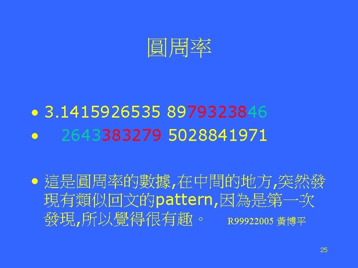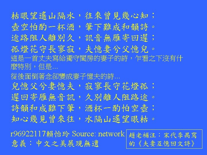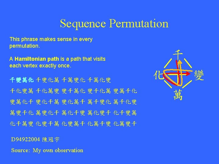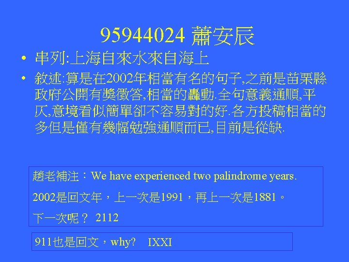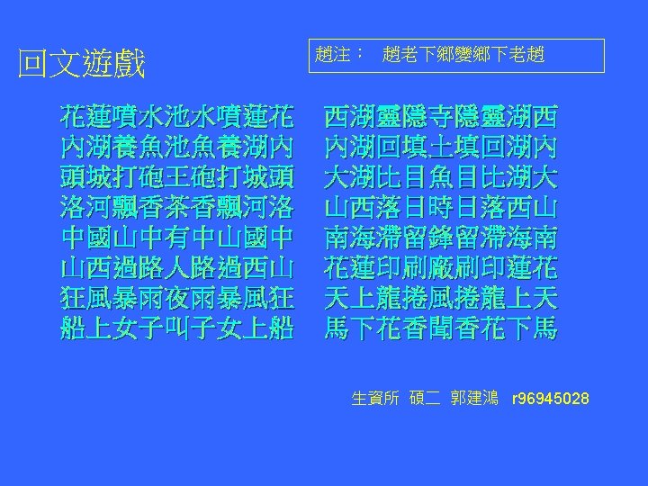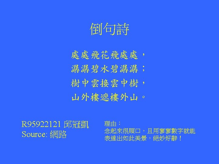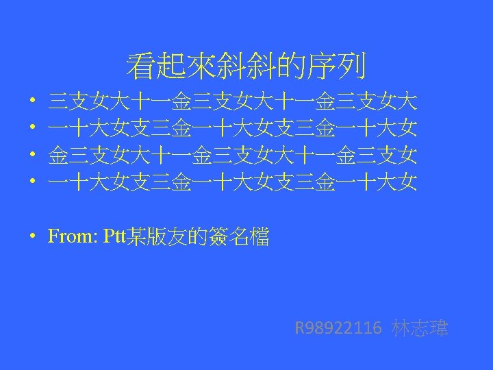 Reverse Sequence The original and the reverse phrases are the same Was it a car or a cat I saw? Was I tac a ro rac a ti saw Hsiao-tse Chang (張孝澤) d 96945015 Source: Internet