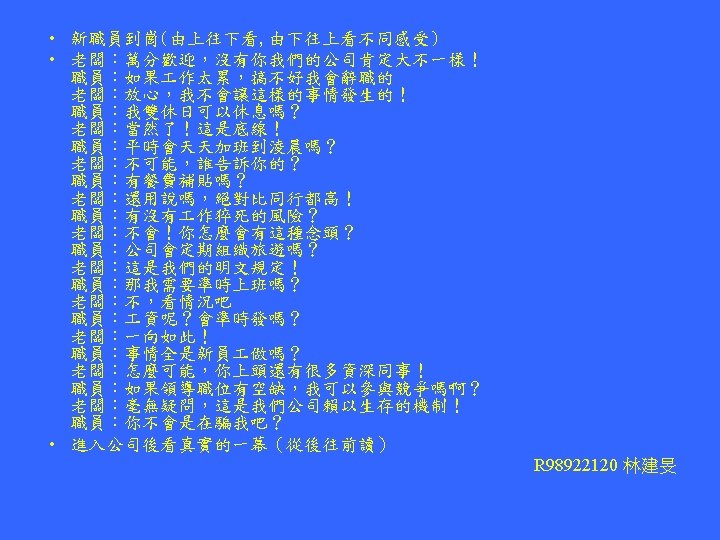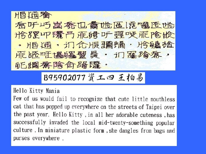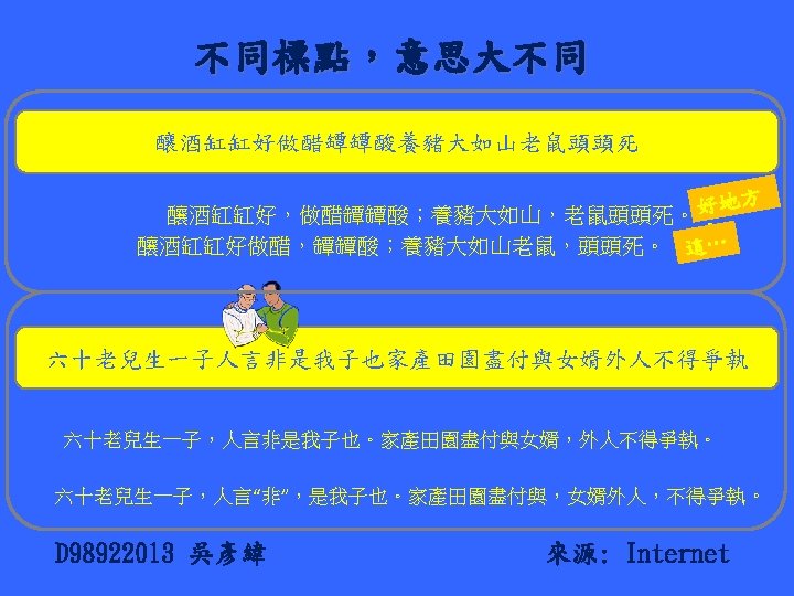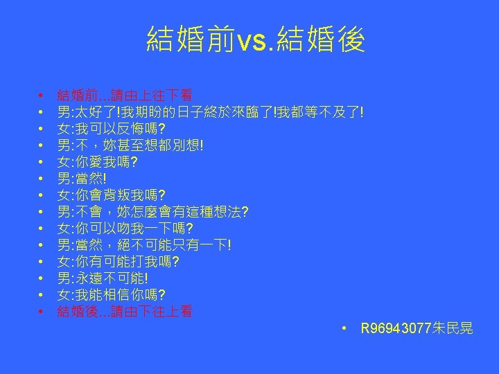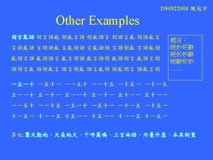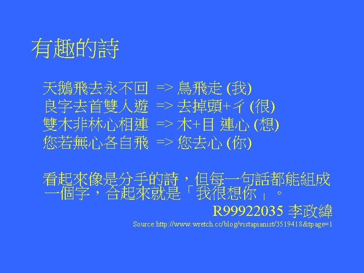 R 96945033翁小涵 A Gentleman = Elegant Man Astronomer = moon starer The Country = No City Dust Side Here Eleven plus two = Twelve plus one • Dormitory = Dirty Room New York = monkeys write Times Bill Gates = gets a bill Princess Diana = end is a car spin George Dubya = You're Bad Egg Hello Kitty = Kill The Toy Mother-in-law = Woman Hitler Desperation = A Rope Ends It I'm pregnant = parting men Darling I love = Avoiding our you yell Anagrams 將一個英文單字中包含 的字母重新排列後,產 生新的意思,以下為在 網路上找到的例子。