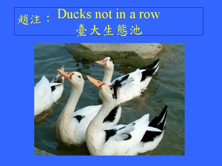 Ducks in a row Source: Internet It's really interesting to see ducks walking in a row! And the most interesting part is that the phrase “ducks in a row” also means to organize things well, and that is what I need to do now! R 97922071 莊秋芸