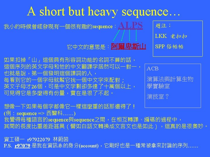 Sequence Analysis-HW 1 Guess what are these two blank spaces should be? F E OTT□FSS□NT WHY? One Two Three Four Five Six Seven Eight Night Ten I think it is very interesting because when you know the answer, you will find out the relation between these characters immediately. But it is really hard to find out the answer by yourself. This is a question about an interesting string, which my cousin asked me two years ago. 資 三 呂哲安 B 94902097