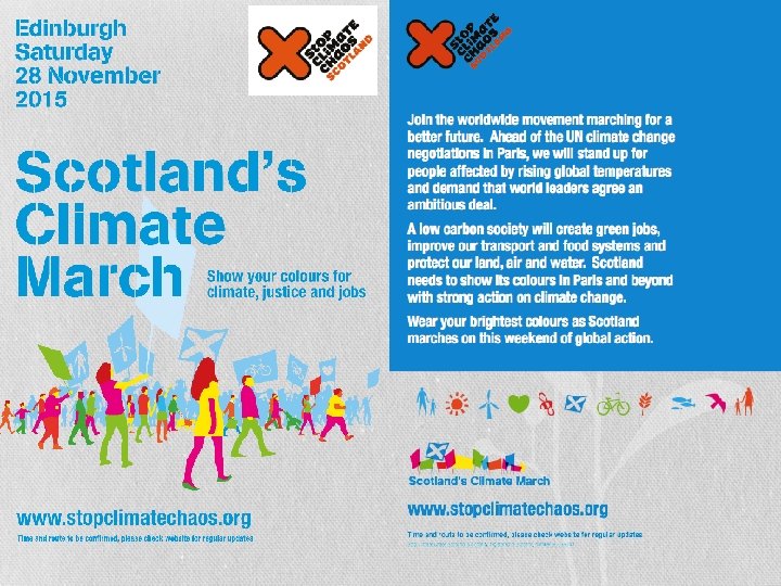Personal Action • Transport - Active travel such as walking /cycling, using public transport and flying less • Home - Turn down heating • Food - Eating locally sourced food • Demand action from our political leaders at the Paris Summit - Join ‘The People’s Climate March’ on the 28 th of November in Edinburgh - It may be for different reasons that we are all there, but we have one common goal – care for our shared environment