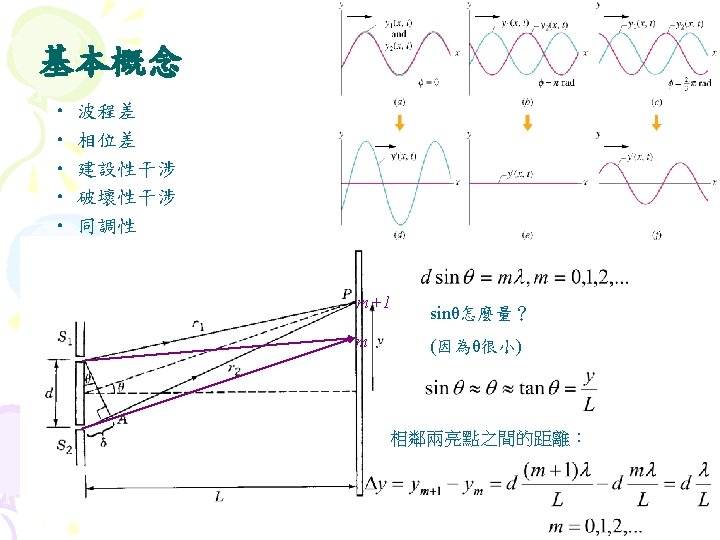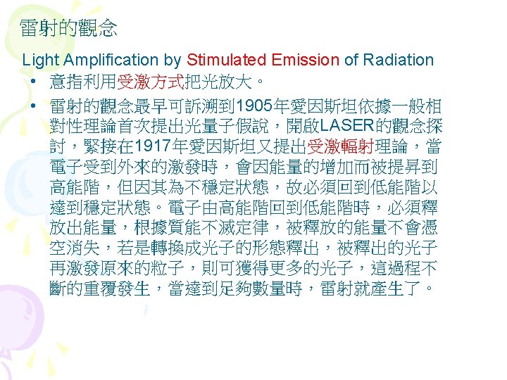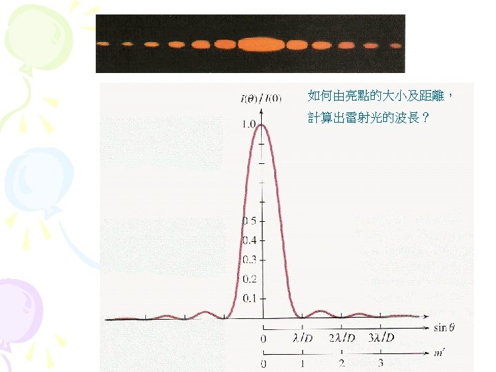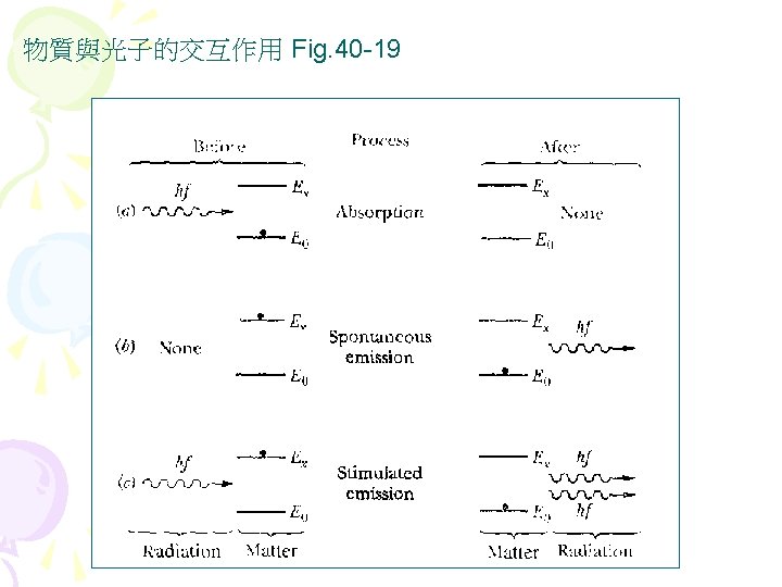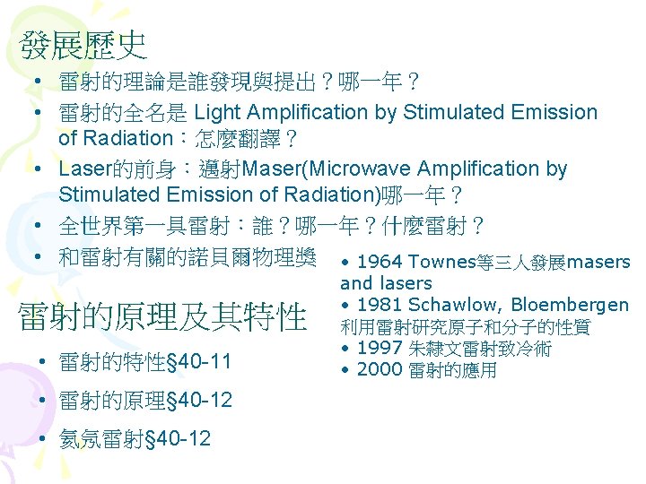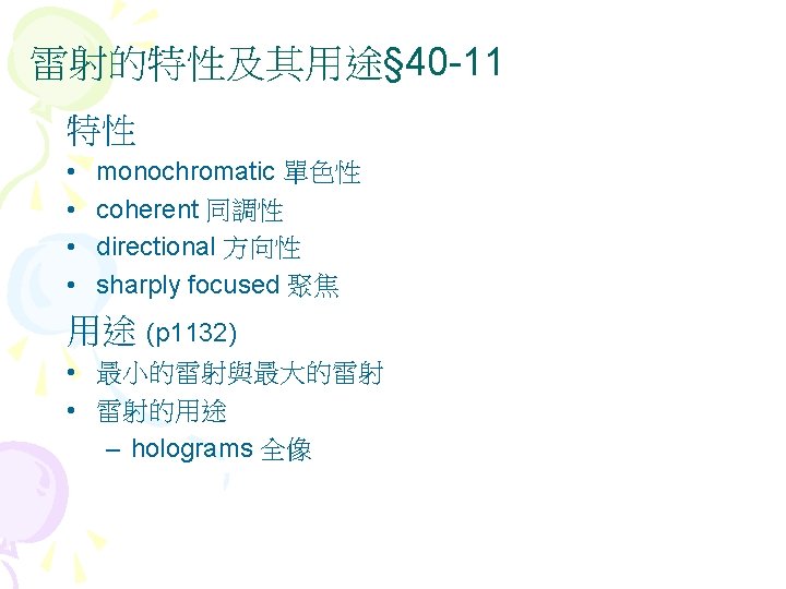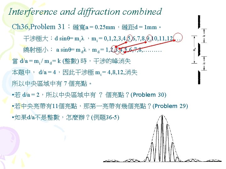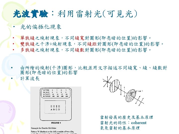 Interference diffraction coherent 35 5 interference Fig 35 Slides: 27 Download presentation Interference (干涉) diffraction (繞射) 同調性coherent(§ 35 -5) 雙狹縫干涉(interference) Fig 35 -8 • 1801年,Young干涉實驗 • 遠場光學vs. 近場光學 • Huygens principle 雙狹縫干涉(interference) 干涉(interference) & 繞射(diffraction) Fig. 36 -10 亮紋或暗紋? Fig. 36 -5 亮紋或暗紋? 雷射 • laser名稱的來源 – Light Amplification by Stimulated Emission of Radiation s s 雷射的特性 同調性coherent 雷射的原理 氦氖雷射的原理 雷射§ 40 -11, § 40 -12 Light Amplification by Stimulated Emission of Radiation 雷射的原理 § 40 -12 物質與光子的交互作用 Fig. 40 -19 • Absorption 吸收 • hf = Ex-E 0 • Ex:激態excited state; E 0:基態ground state • spontaneous emission 自發輻射 • metastable states 暫穩態 • stimulated emission 受激輻射 • ★population inversion 粒子數反轉 Fig. 40 -20 • 熱平衡時粒子數的分佈 – 例題:Sample Problem 40 -6 – Homework:ch 40 Problem 47 Question 14 He-Ne Gas Laser • He-Ne Gas Laser – He 80%, Ne 20% – Ne 為此雷射之活性介質 (active medium) • He-Ne Gas Laser的能階 – E 2- E 1= ? e. V – Question 13 • E 3(20. 61 e. V)≠E 2(20. 66 e. V) – Ch 40 Problem 58:火星 上的CO 2雷射 Fig. 40 -22