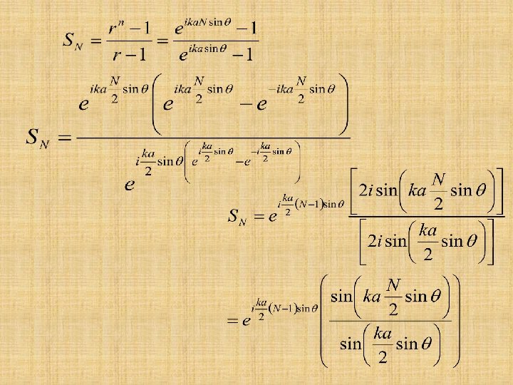 Apabila fungsi gelombang yang berasal dari celah sempit pertama (celah sempit paling atas dititk A) adalah: Misalkan: Sehingga di titik P akan terjadi superposisi dari deret ukur dengan rasio