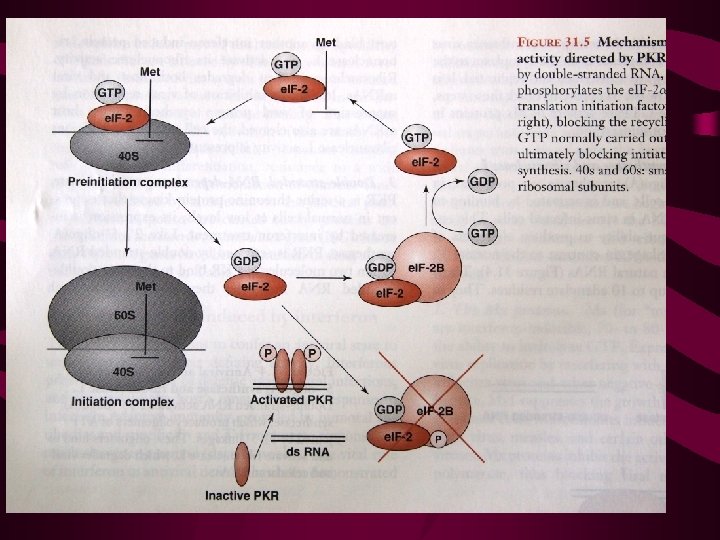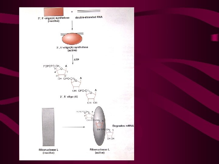 ANTI-VIRAL STAGE • The second stage represents the creation of an anti – viral state in the neighbouring cells by the released intrferon binding to the interferon specific receptor on their cell surface. • In man, chromosome 21 is required and perhaps codes for the synthesis of interferon receptor molecules. • The anti-viral state has two modes of action • ds RNA in the presence of interferon induced anti viral state stimulates the phosphorylation of certain cellular proteins resulting in • (i) impairs their function in the initiation of protein synthesis, • (ii) ds RNA activates a ribonuclease which degrades m. RNA and hence also stops protein synthesis.