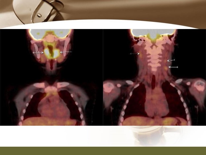 PET/CT Report v. Multiple hypermetabolic bilateral cervical lymph nodes (more on the left), likely nodal metastases. v. Multiple pulmonary nodules, probably pulmonary metastases. v. Multiple small hypermetabolic poorly osteolytic and nonosteolytic lesion, probably inhomogeneous marrow activity in child or foci of marrow infiltration. Correlation with other imaging modality such as bone scan is recommended