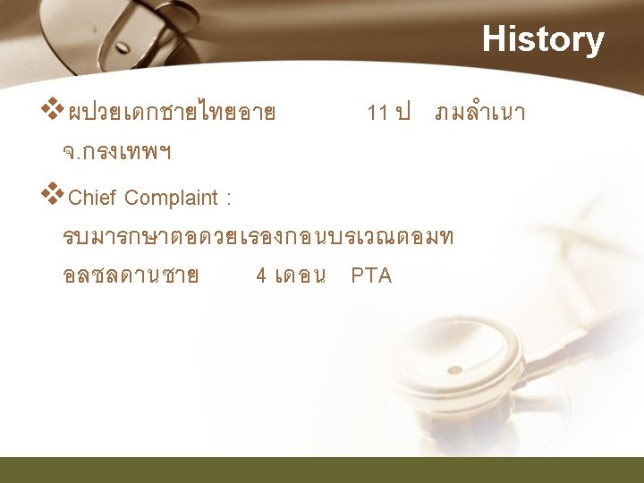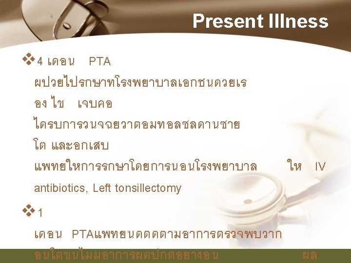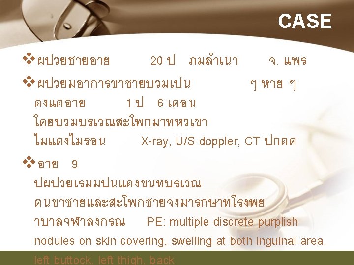 Progression v 03/08/52 Start Radiotherapy at tonsils and lymph node 70 Gy v 06/08/52 รบ consult at OPD ผปวยมปญหาเรองปวดทขาขางขวาต งแตตนขาถงปลายขา ไมมปวดบรเวณอน § CBC: Hb 8. 8 g/dl , WBC 11, 800 cells/mm 3 (N 78. 3 %, L 14. 9 %, M 3. 6% , E 2. 9% , B 0. 3% ), Platelet 122, 000 cells/mm 3 § LD-PRC 300 ml IV drip in 3 hour