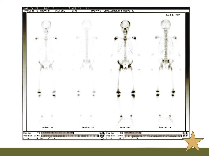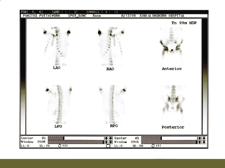 Progression v 7/8/52 CBC: Hb 11 g/dl , WBC 9, 850 /mm 3 (N 66 %, L 21 %, M 3% , E 7% , AL 3% ), Platelet 104, 000 /mm 3 PTT 36. 8 sec [30. 4] PT 15. 4 sec [13. 4] Fibrinogen 641 mg/dl D-dimer 0. 2 mcg/dl [< 0. 3] v 10/08/52 OPD Follow up ผปวยยงมอาการปวดขาไมดขน Bonefos (800) 2 cap oral OD เชา
