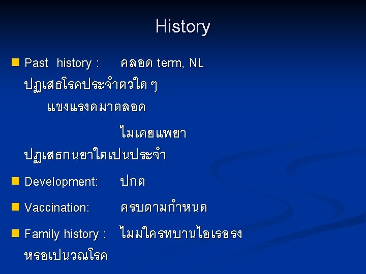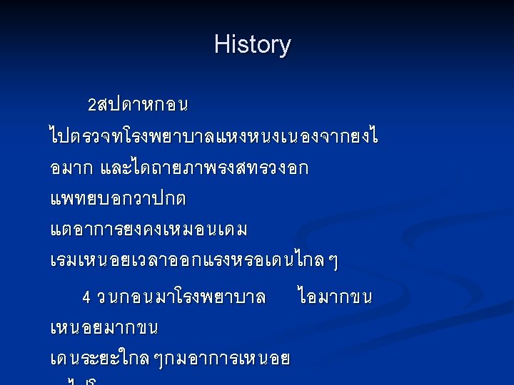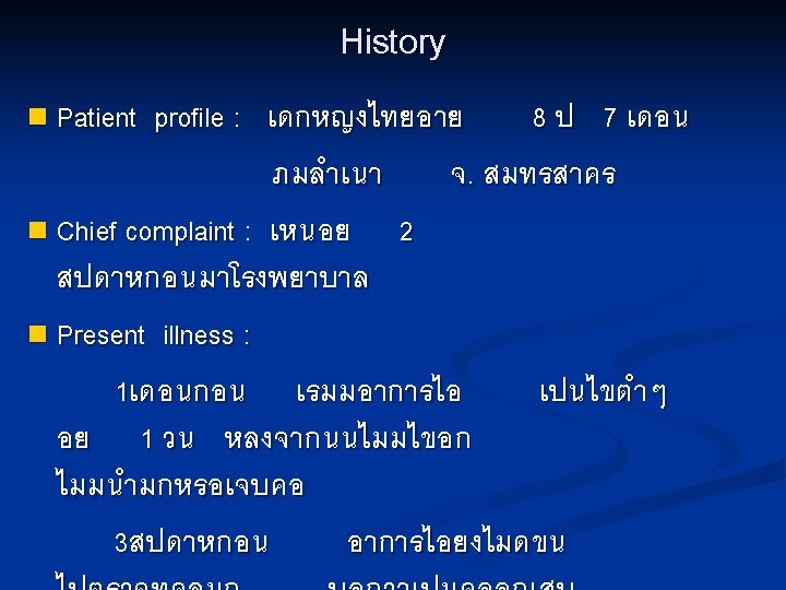 Investigation n CBC : n ESR: n U/A : Hb 14. 8 g/dl, Hct 43. 6%, WBC 10, 100 /mm 3 ( N 71%, L 21%, M 7. 5%, Eo 0. 5% ) plt 356, 000 /mm 3, MCV 80. 5 fl, MCH 27. 4 pg, MCHC 34. 1 g/dl 47 mm/hr (4 -20) p. H 7, Sp. gr 1. 010, prot- neg, sugar- neg, ketone- neg, WBC 0 -1 /HF, no RBC