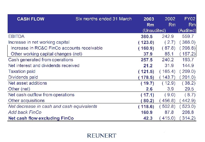 INCOME STATEMENT Six months ended 31 March (Unaudited) Revenue EBITDA Depreciation and goodwill Operating profit Net interest and dividend income Profit before taxation Taxation Profit after taxation Share of associate companies' profits Profit after tax including associate companies Attr earnings - Minorities Attr earnings - RLO shareholders Basic EPS (cents) Diluted basic EPS (cents) HEPS (cents) Diluted HEPS (cents) Dividend per ordinary share (cents) Tax rate excl amort & abnormal items (%) EBITDA as a % of turnover 2003 Rm 3 047. 5 380. 5 47. 2 333. 3 21. 2 354. 5 124. 8 229. 7 ( 21. 3) 208. 4 16. 4 192. 0 102. 1 100. 6 115. 4 113. 6 32. 0 33. 0 12. 5 2002 Rm 2 469. 4 242. 9 37. 8 205. 1 15. 5 220. 6 79. 2 141. 4 48. 3 189. 7 14. 5 175. 2 93. 7 92. 0 101. 2 99. 2 30. 0 33. 8 9. 8 % Change 23 57 25 63 37 61 58 62 10 13 10 9 9 14 14 7