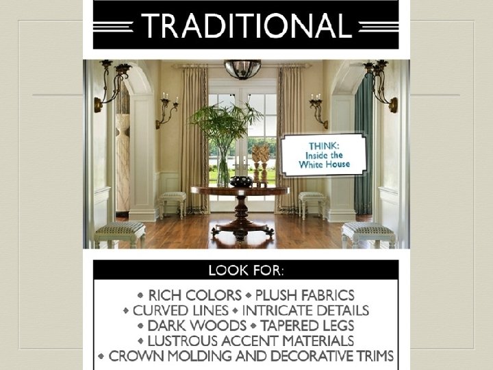 Floor Plan Assignment Continued… Scaling- Is it scaled properly? Elements of design- Include all the elements of design and explain how you tied them in and why. Line and Neatness- Was the drawing, organized and neat? Are the lines straight and proportional? Items you may include: Bed, Night Stand, Rug, Closet, Lamp, Artwork, Desk, House Plants, etc.