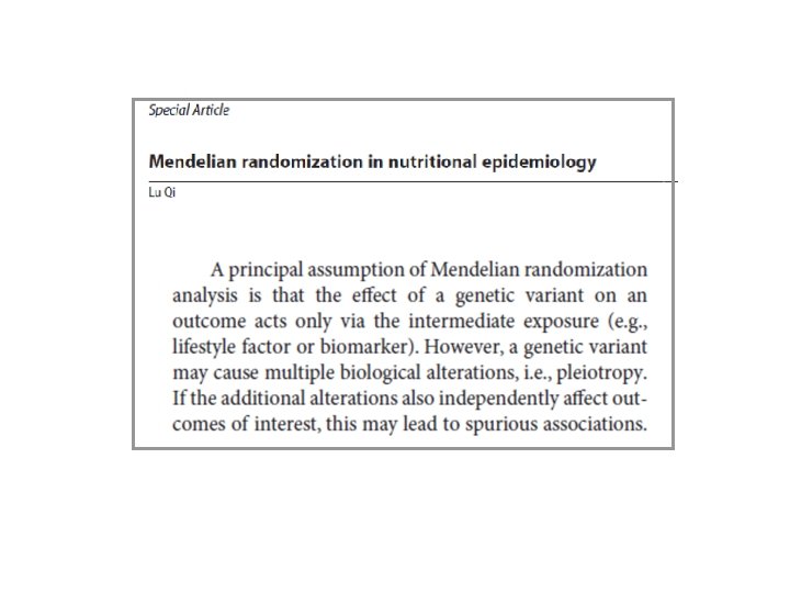Some comments It is necessary to perform comprehensive analysis to demonstrate Whether the genetic effect is pleiotropic The genetic variants may affect multiple molecular risk factors and therefore not suitable for MR analysis Genetic association analysis on the markers with pleiotropic effects may still provide evidence for causal relation, which may involve the combined contribution of multiple risk factors