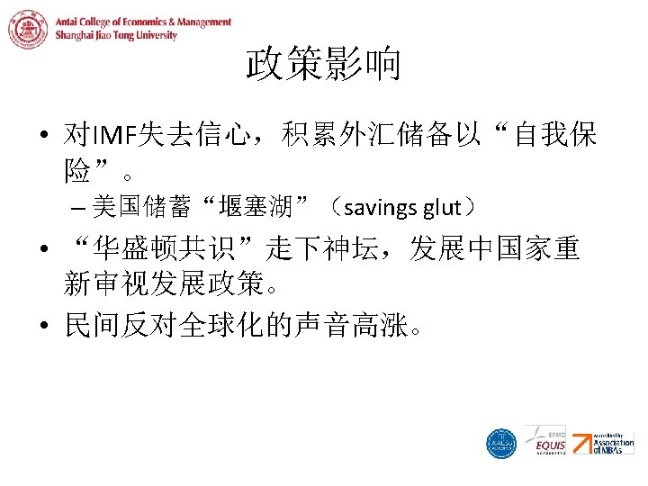 经济影响 • 危机导致东南亚以及 韩国经济大幅缩水, 多年以后美元计价的G DP才回到 1996年水平。 • 除韩国外,东南亚没 能延续 80年代到 1996 年的高增长。 Per Capita GDP Index (1996: 100) 350 300 250 200 150 100 50 0 1996 1997 1998 1999 2000 2001 2002 2003 2004 2005 2006 Indonesia Malaysia Thailand South Korea Philippines China