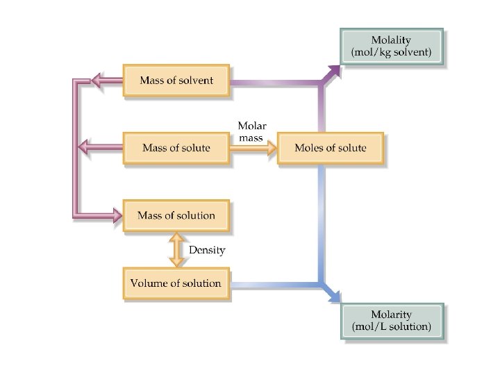 Concentration molality and Molarity • Molality relates to colligative properties. • Converting between molarity (M) and molality (m) requires density. • Therefore Molarity and molality are most often not equal