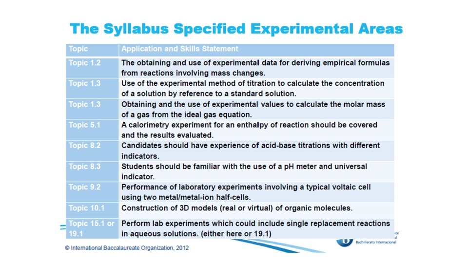 Internal Assessment - The Facts The six mandotary areas in Chemistry are: • Topic 1: Determining empirical formula from mass changes. • Topics 1 and 8: Titration. • Topic 1: Determining the molar mass of a gas. • Topic 5: Enthalpy of a reaction by calorimetry. • Topic 9: Reactions involving voltaic cells. • Topic 10: Construction of 3 -D models of organic molecules. • In addition students are required to spend ten hours on the group 4 project but this does not count towards the final internal assessment mark.