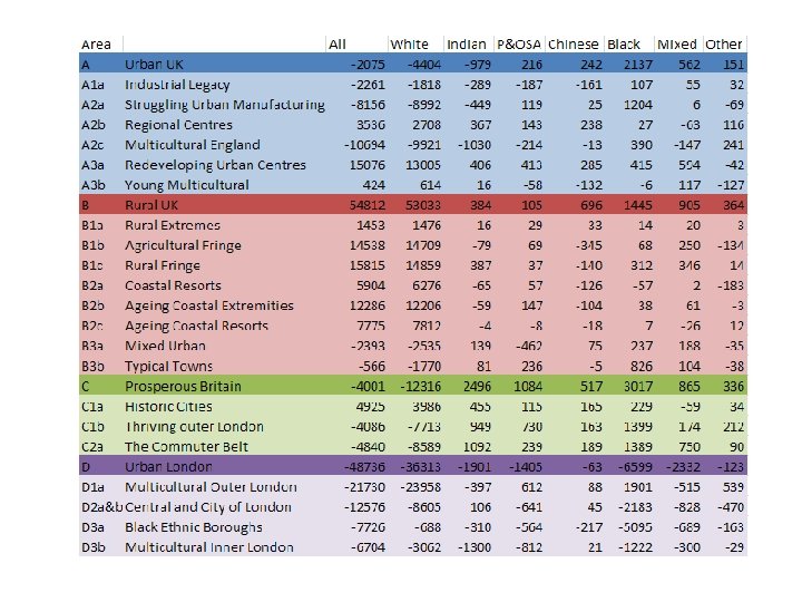 Summary at Vickers et al level • Trends at Family level • It is difficult to talk about general trends as there is diversity for total populations • More Ethnic Minorities leave Ethnic Minorities areas than migrate to them