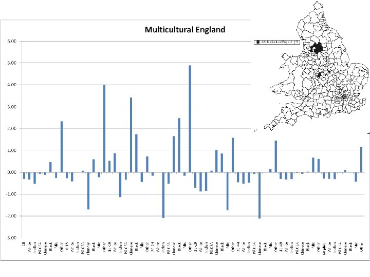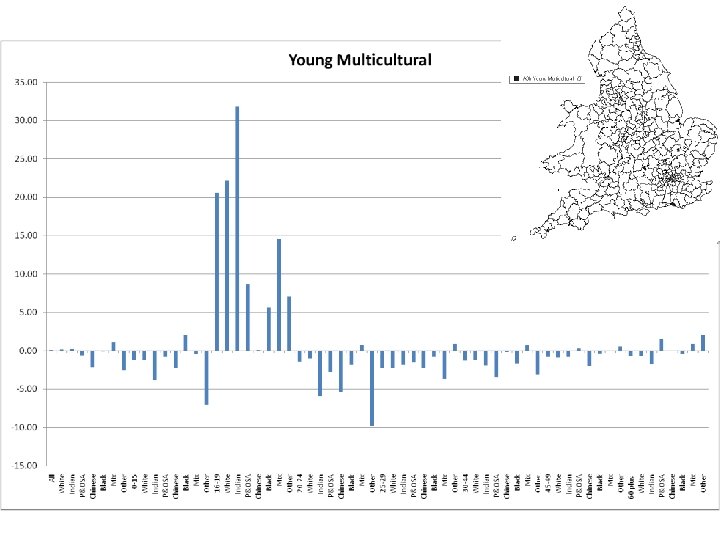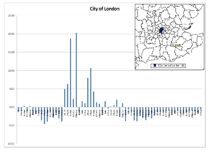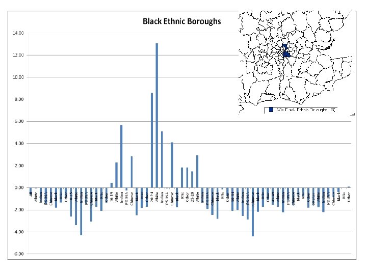 The Data • Specially commissioned table C 0711 a • 7 ethnic groups: White, Indian, Pakistani and Other South Asian, Chinese, Black, Mixed and Other • 7 age groups: 0 -15, 16 -19, 20 -24, 25 -29, 30 -44, 45 -59, 60 and older • Migration flows between 376 LADs • Population at risk data derived from ST 101