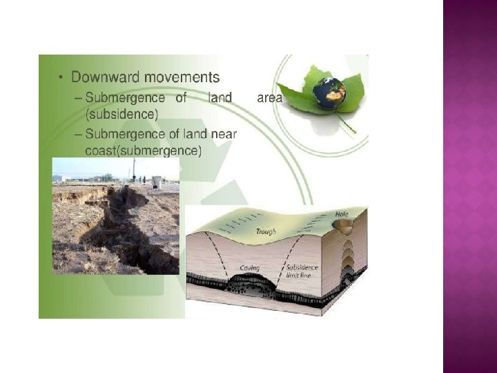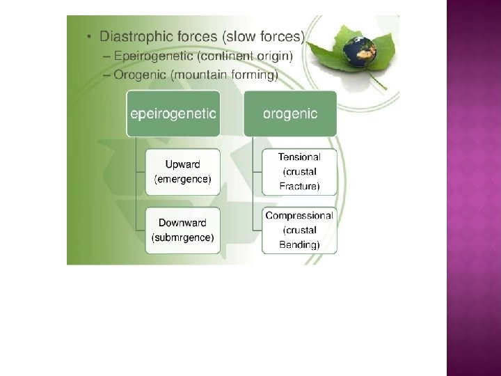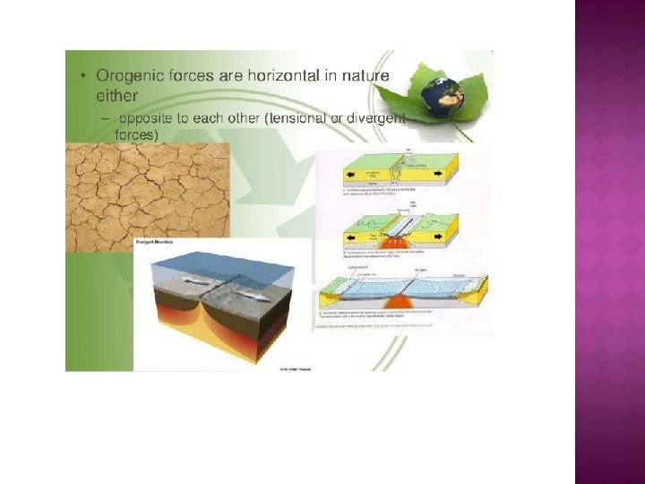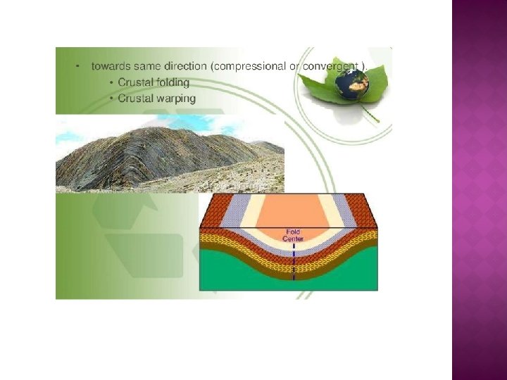 In contrast to epeirogenic movement, the orogenic movement is a more complicated deformation of the Earth’s crust, associated with crustal thickening (due to the convergence of tectonic plates). � Such plate convergence forms orogenic belts that are characterised by “the folding and faulting of layers of rock, by the intrusion of magma, and by volcanism. � Orogenic or the mountain-forming movements act tangentially to the earth surface, as in plate tectonics. � Tension produces fissures (since this type of force acts away from a point in two directions), and compression produces folds (because this type of force acts towards a point from two or more directions). �