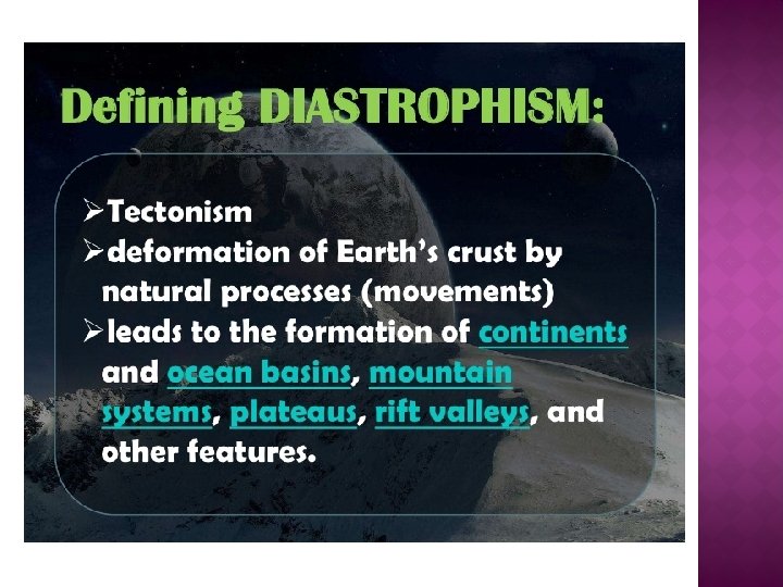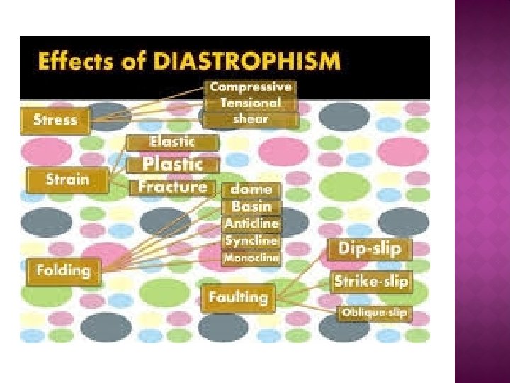 � Diastrophism is the process of deformation of the Earth's crust which involves folding and faulting. Diastrophism can be considered part of geo tectonics. The word is derived from the Greek διαστροϕή diastrophḗ 'distortion, dislocation'. Ø Epirogeneic Movement Ø Orogenic Movement