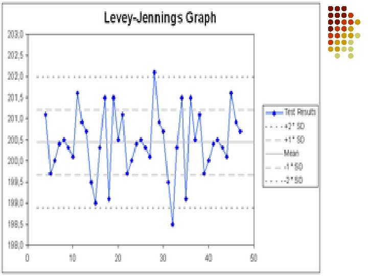 Levey-Jenning Control A leavey - Jenning Control Chart depend on the use of IQC specimens and is developed in the following manner: - Put up the IQC specimen for at least 20 or more assay runs and record down the value / O. D. Calculate the mean and standard deviations (S. D. ) Make a plot with the assay run on the x-axis, and value / O. D. on the y axis. Draw the following lines across the y-axis: mean, -3, -2, -1, mean, 1, 2, and 3 S. D. Plot the value / O. D. obtained for the IQC specimen for subsequent assay runs Major events such as changes in the batch no. of the IQC sera and instruments used should be recorded on the chart.
