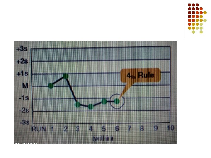 Warning 41 SD : It is violated if four consecutive IQC values exceed the same limit (mean � 1 SD) and this may indicate the need to perform instrument maintenance or reagent calibration.