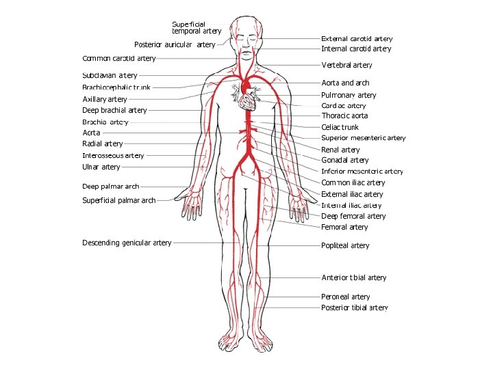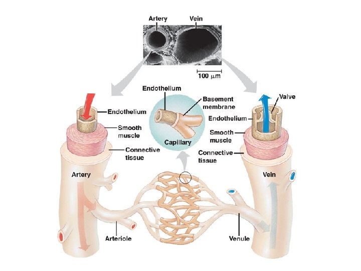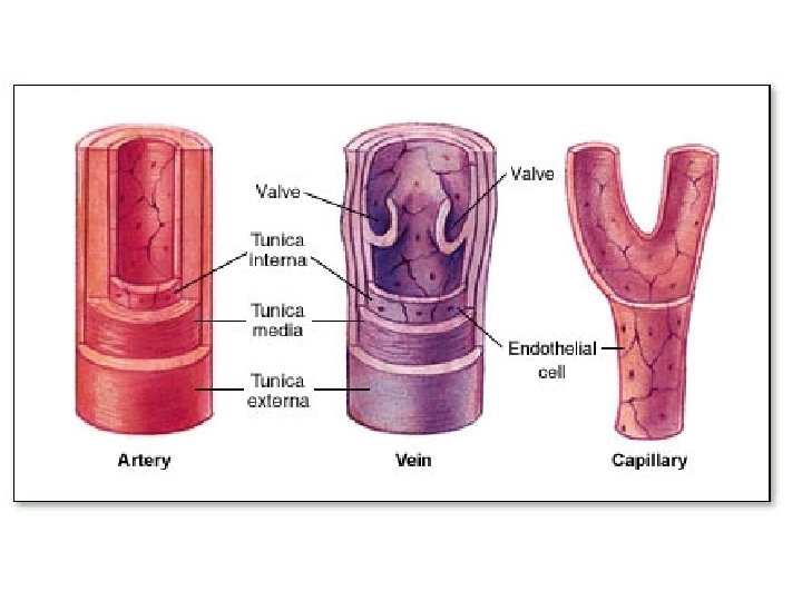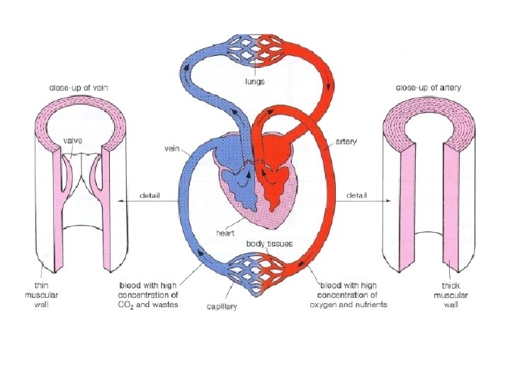 Blood vessels 3 main types: • Arteries: carry blood away from the heart, thick walled, under high pressure (arterioles link to capillaries). • Veins: carry blood back to the heart, thinner walls than arteries, larger internal diameter, valves stop back flow (venules link to capillaries). • Capillaries: smallest vessels, fluid leaks out of capillary walls to bathe surrounding tissue cells to exchange gases, nutrients, wastes and kill germs