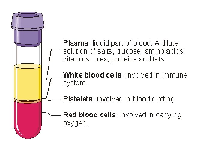 Blood Components • Red Blood Cells (RBC) – full of haemoglobin (an iron based molecule) which carries oxygen, disc shaped cells with no nucleus so cannot self-repair, made in bone marrow. • White Blood Cells (WBC) – protects body against disease, cells with a nucleus, no haemoglobin, can move through capillary walls into tissues, made in bone marrow. • Plasma – 90% water, part of blood that RBC, WBC, platelets, nutrients and wastes travel in, carbon dioxide dissolves in as bicarbonate. • Platelets – involved in blood clotting, also made in bone marrow