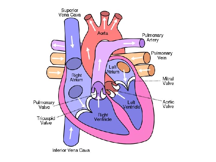 Blood flow in summary Left ventricle – aortic valve - aorta – body – vena cava – right atrium (auricle) – tricuspid valve – right ventricle – mitral (bicuspid) valve - pulmonary artery – lungs – pulmonary vein – left atrium (auricle) – pulmonary valve - left ventricle … and so on…