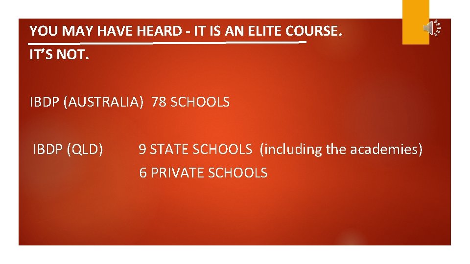 YOU MAY HAVE HEARD - IT IS AN ELITE COURSE. IT’S NOT. IBDP (AUSTRALIA) 78 SCHOOLS IBDP (QLD) 9 STATE SCHOOLS (including the academies) 6 PRIVATE SCHOOLS