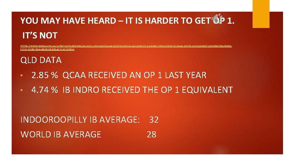 YOU MAY HAVE HEARD – IT IS HARDER TO GET OP 1. IT’S NOT HTTPS: //WWW. NEWS. COM. AU/LIFESTYLE/PARENTING/SCHOOL-LIFE/AUSTRALIAS-ELITE-SCHOOLS-ACCUSED-OF-GAMING-THE-SYSTEM-TO-SNAG-SPOTS-AT-OUR-BEST-UNIVERSITIES/NEWSSTORY/0 B 65 FE 94 A 64 E 6 C 9620914 CDC 422 D 56 A 1 QLD DATA • 2. 85 % QCAA RECEIVED AN OP 1 LAST YEAR • 4. 74 % IB INDRO RECEIVED THE OP 1 EQUIVALENT INDOOROOPILLY IB AVERAGE: 32 WORLD IB AVERAGE 28