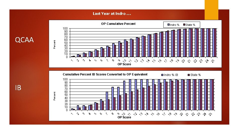 Last Year at Indro …. Indro % 25 24 23 22 21 20 19 18 Indro % IB State % 25 24 23 22 21 20 19 18 17 16 15 14 13 OP Score 12 11 10 9 8 7 6 5 4 3 2 100 90 80 70 60 50 40 30 20 10 0 1 Percent Cumulative Percent IB Scores Converted to OP Equivalent 17 16 15 14 13 12 11 10 9 8 7 6 5 4 3 2 OP Score IB State % 100 90 80 70 60 50 40 30 20 10 0 1 QCAA Percent OP Cumulative Percent