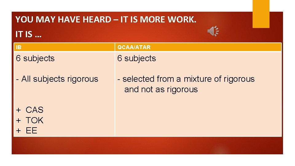 YOU MAY HAVE HEARD – IT IS MORE WORK. IT IS … IB QCAA/ATAR 6 subjects - All subjects rigorous - selected from a mixture of rigorous and not as rigorous + CAS + TOK + EE
