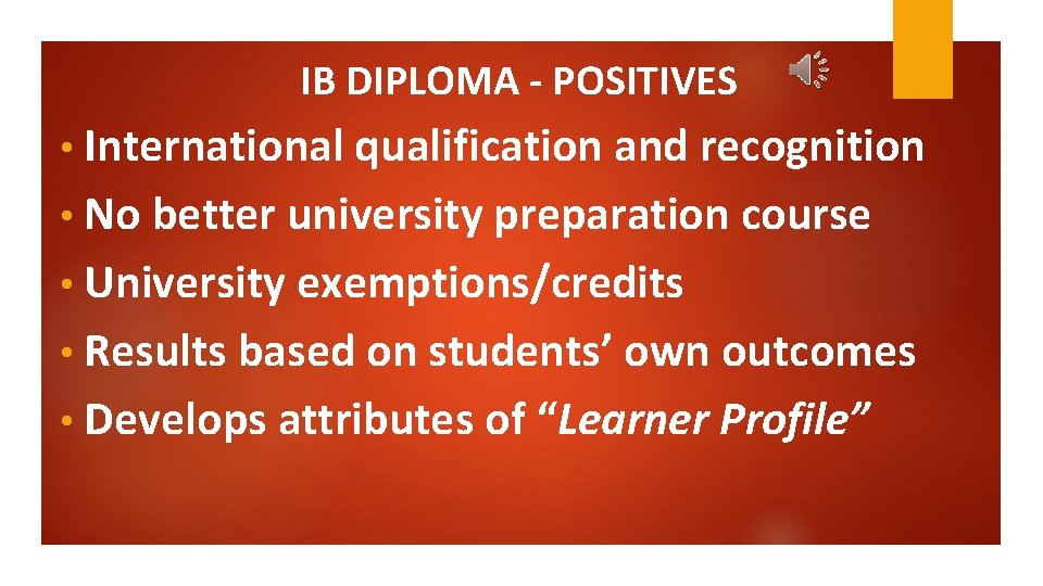 IB DIPLOMA - POSITIVES • International qualification and recognition • No better university preparation course • University exemptions/credits • Results based on students’ own outcomes • Develops attributes of “Learner Profile”
