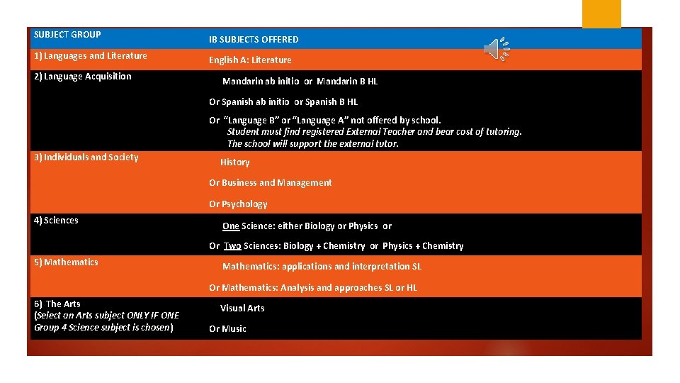 SUBJECT GROUP IB SUBJECTS OFFERED 1) Languages and Literature English A: Literature 2) Language Acquisition Mandarin ab initio or Mandarin B HL Or Spanish ab initio or Spanish B HL Or “Language B” or “Language A” not offered by school. Student must find registered External Teacher and bear cost of tutoring. The school will support the external tutor. 3) Individuals and Society History Or Business and Management Or Psychology 4) Sciences One Science: either Biology or Physics or Or Two Sciences: Biology + Chemistry or Physics + Chemistry 5) Mathematics: applications and interpretation SL Or Mathematics: Analysis and approaches SL or HL 6) The Arts (Select an Arts subject ONLY IF ONE Group 4 Science subject is chosen) Visual Arts Or Music