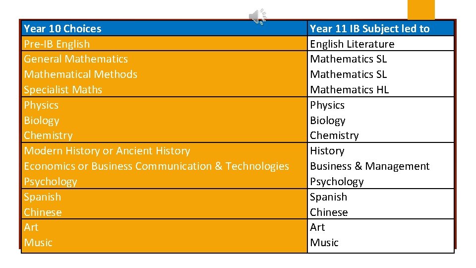 Year 10 Choices Pre-IB English General Mathematics Mathematical Methods Specialist Maths Physics Biology Chemistry Modern History or Ancient History Economics or Business Communication & Technologies Psychology Spanish Chinese Art Music Year 11 IB Subject led to English Literature Mathematics SL Mathematics HL Physics Biology Chemistry History Business & Management Psychology Spanish Chinese Art Music