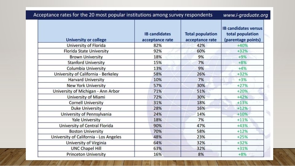 STATISTICS • The average acceptance rate of IB students into university/college is 22% higher than the average acceptance rate of the total population. • The acceptance rate of IB students into Ivy League institutions (Princeton, Yale, Brown, Harvard, Columbia, Cornell, Dartmouth, University of Pennsylvania) is between 3% and 13% higher compared to the total population acceptance rate.